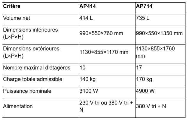 L’AP414, plus compacte en hauteur, constitue un compromis pertinent pour les laboratoires disposant d’un espace vertical limité ou souhaitant contenir les contraintes électriques. La modularité interne diffère également : l’AP714 accepte davantage d’étagères et une charge totale plus élevée, facilitant l’organisation de grandes séries.